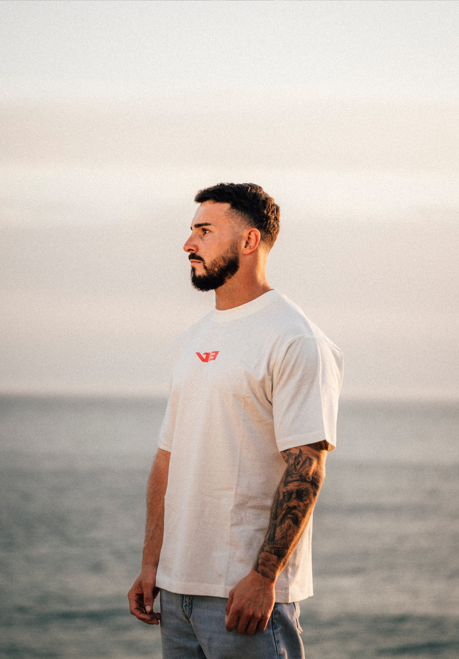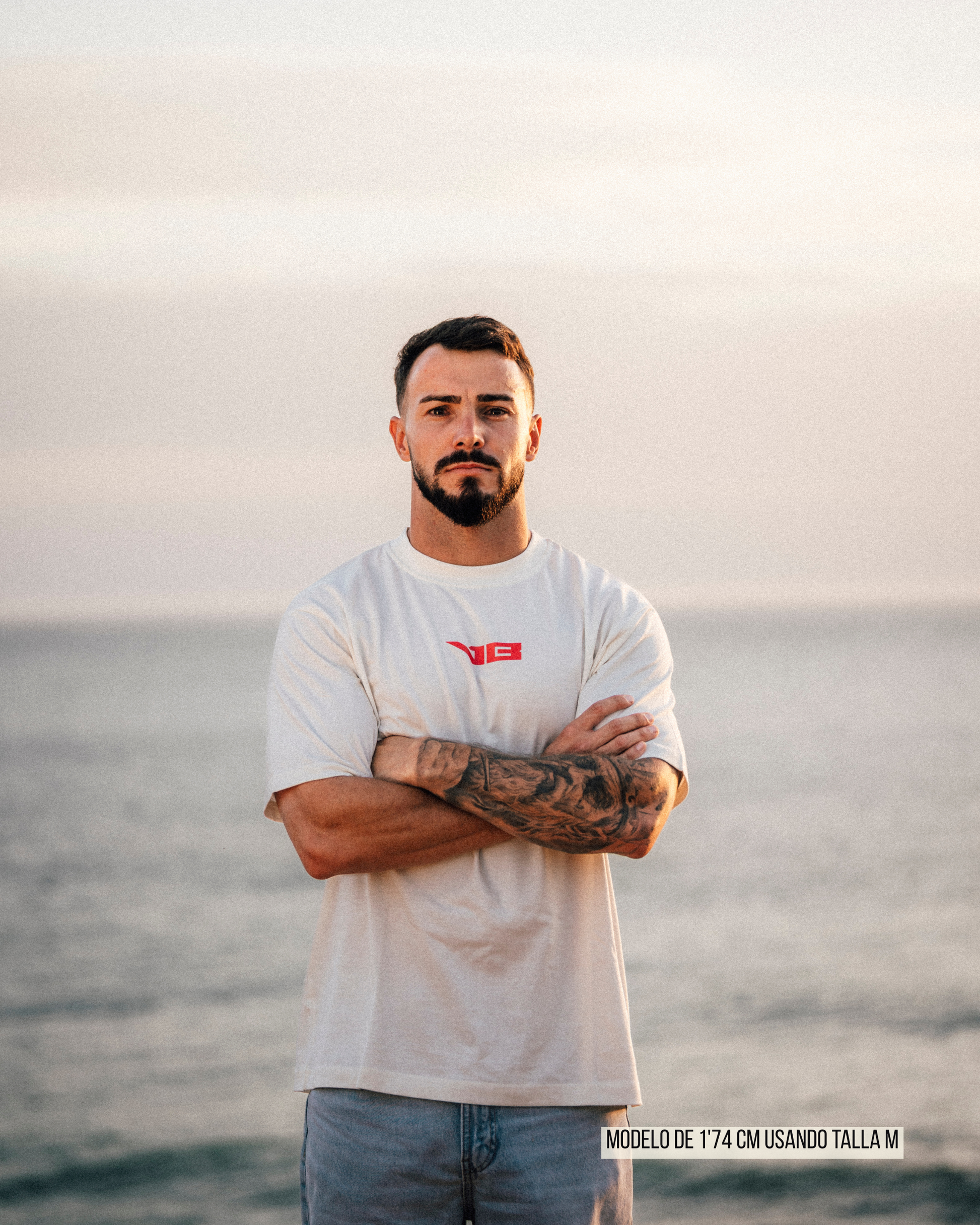 Camiseta oversize unisex con caída amplia. Disponible en colores crema y negro. Tallas S–XL. Corte cómodo y atemporal.